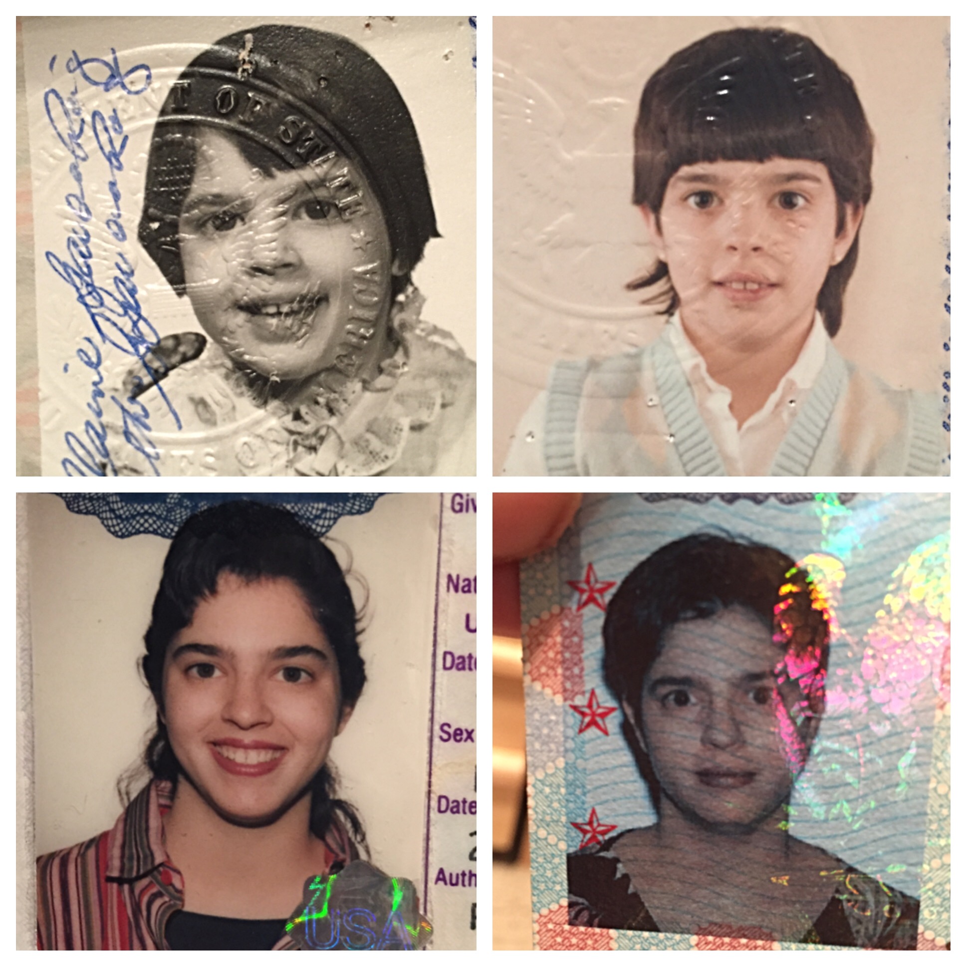 BONUS PHOTO: My four older passport photos (I hate my current one so I did not include it) – me at 5, 10, 20 and 30!